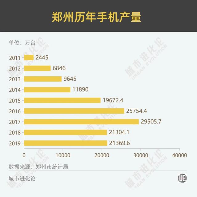 富士康的到来使得郑州成为电子信息产业聚集地,一跃成为重要的手机生产基地。2011年,也就是富士康落地郑州的第二年,郑州统计局首次在年度统计公报中,将手机产量作为一项单独数据披露,当年郑州生产了2445万台手机。此后几年,郑州手机产量成倍上涨,2012年为6846万台,2013年9645万台。仅仅三年后的2014年,郑州手机产量就已破亿,达到1.19亿台。最高峰是在2017年,当年郑州手机产量接近3亿台。