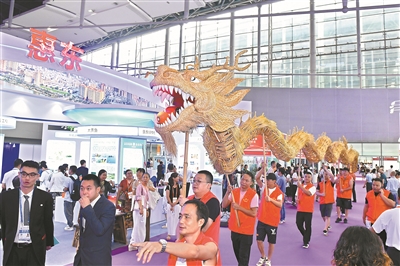 “咚咚锵”随着锣鼓敲响,一条金黄色长龙在县博会上游走,这是来自广东河源市东源县的“追龙”。现场亮相的这条“香火龙”,由80多名村民历时数月制作而成,如今成为东源县展区最吸睛的“广告”。
