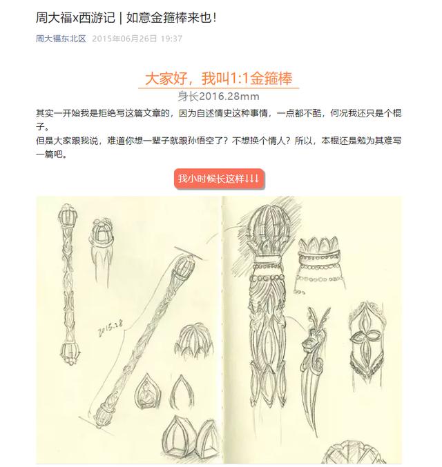 红星资本局发现,早在2015年6月,认证为“周大福珠宝金行(沈阳)有限公司”的微信公众号“周大福东北区”发布过一篇文章,题为“周大福x西游记 | 如意金箍棒来也!”。文章内容显示:我叫1:1金箍棒,身长2016.28mm。文章中配有2015年6月13日上海国际电影节电影发布会的图片,图片里出现了该金箍棒。