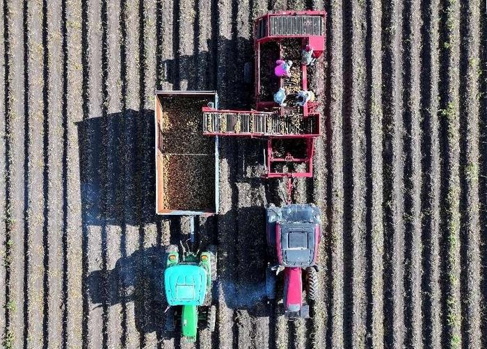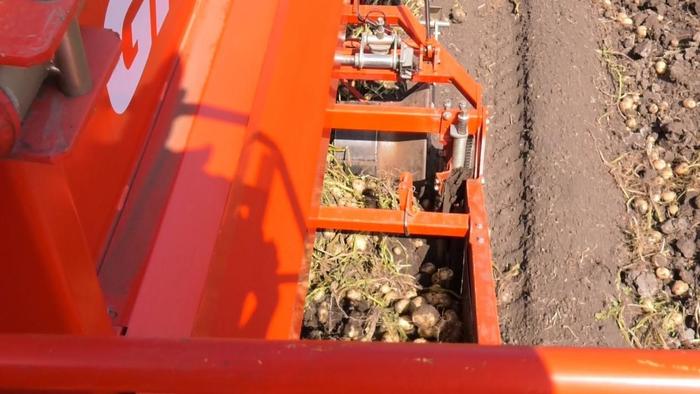 8月28日早上,一台大马力拖拉机牵引着马铃薯收获机正在缓慢行驶。只见机车底部的收割器将茎叶的残余切碎并快速破垄,一颗颗浑圆硕大的马铃薯“排队”进入晃动筛,过滤掉裹挟的泥土后,从传送带纷纷涌进接粒车内,不一会儿就堆起金黄的小山。