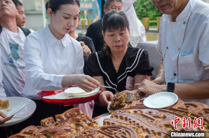 中新网北海8月29日电(翟李强林启波徐畅)8月29日,“中国大月饼美食之乡”——广西合浦县举办合浦月饼小镇2024年月饼文化周活动,现场一个约200斤的大月饼给民众免费分享。