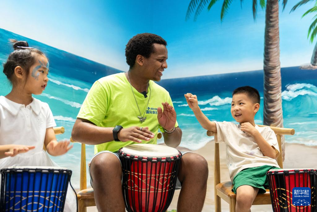 8月30日,在位于湖南高桥大市场的中非经贸博览会常设展馆,志愿者(中)带领游客体验非洲鼓。新华社记者陈思汗摄