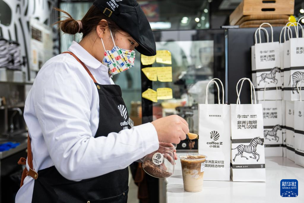 2024年1月31日,在湖南高桥大市场非洲咖啡交易中心,咖啡店工作人员在制作咖啡饮品。新华社记者陈思汗摄