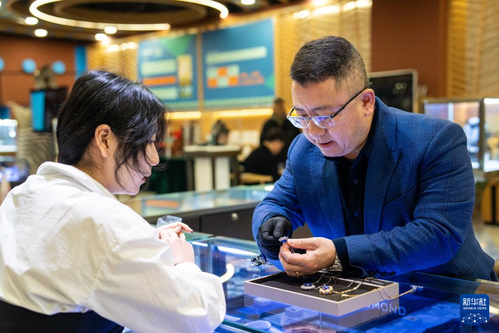 2024年1月31日,在位于湖南高桥大市场的中非经贸博览会常设展馆,工作人员(右)向消费者介绍进口首饰。新华社记者陈思汗摄