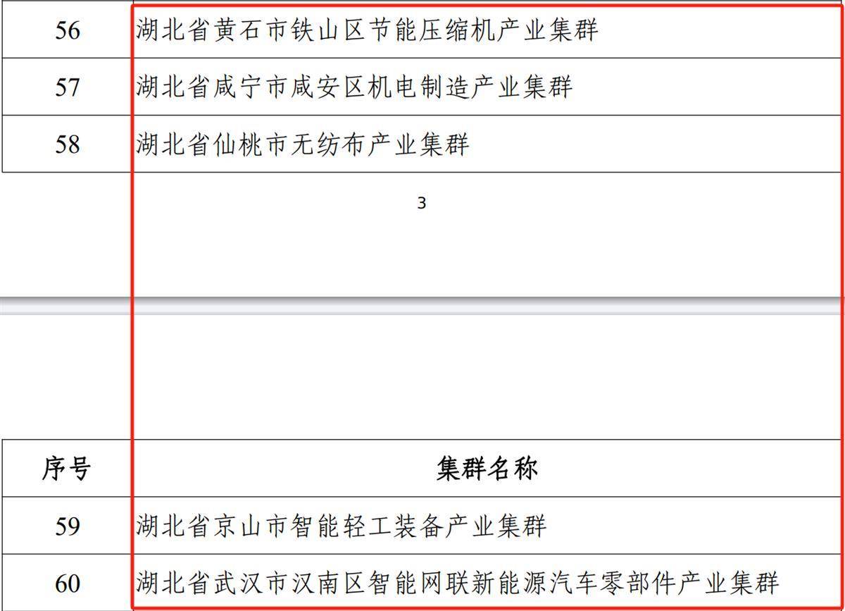 湖北入选的特色产业集群分别是:黄石市铁山区节能压缩机产业集群、咸宁市咸安区机电制造产业集群、仙桃市无纺布产业集群、京山市智能轻工装备产业集群、武汉市汉南区智能网联新能源汽车零部件产业集群。