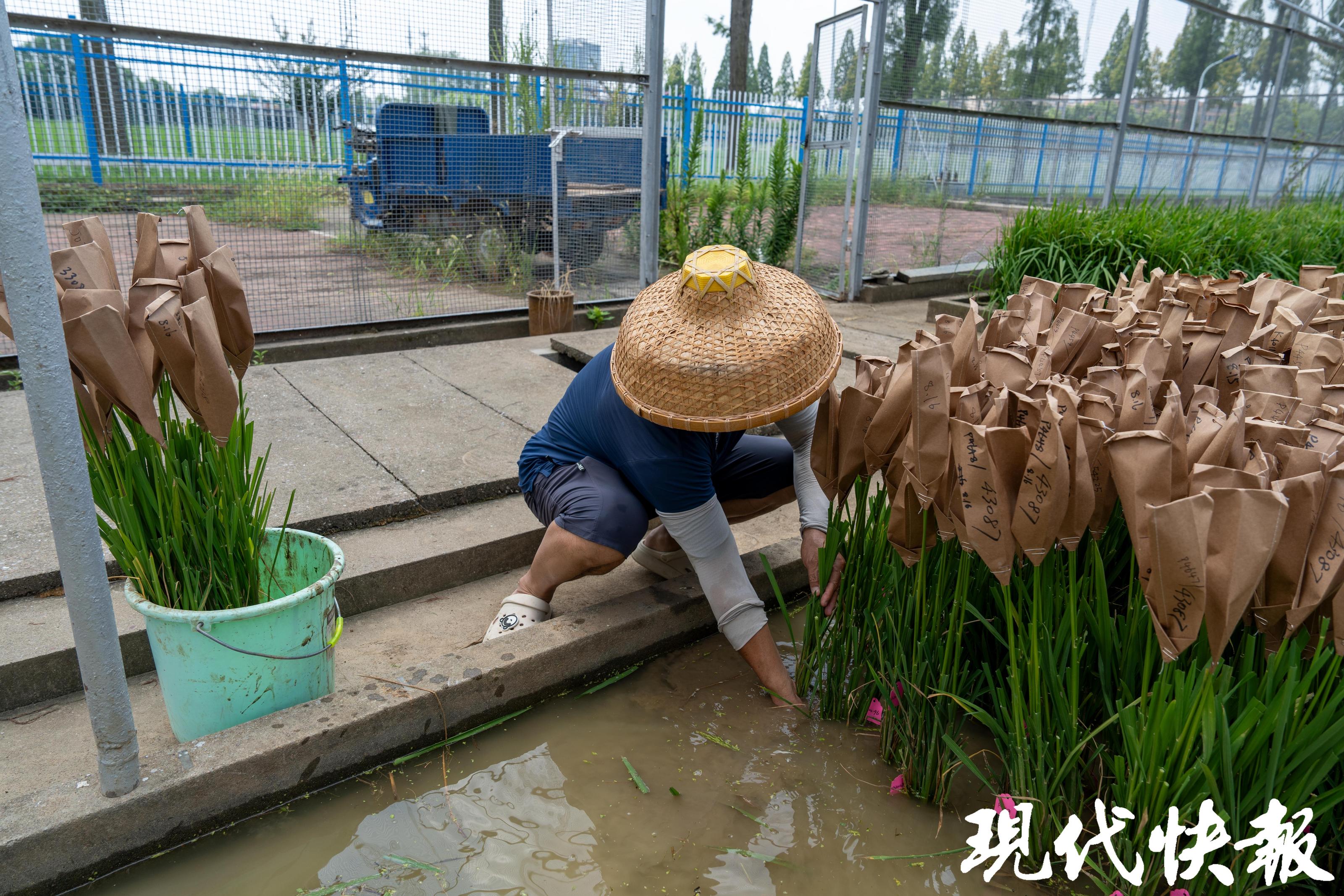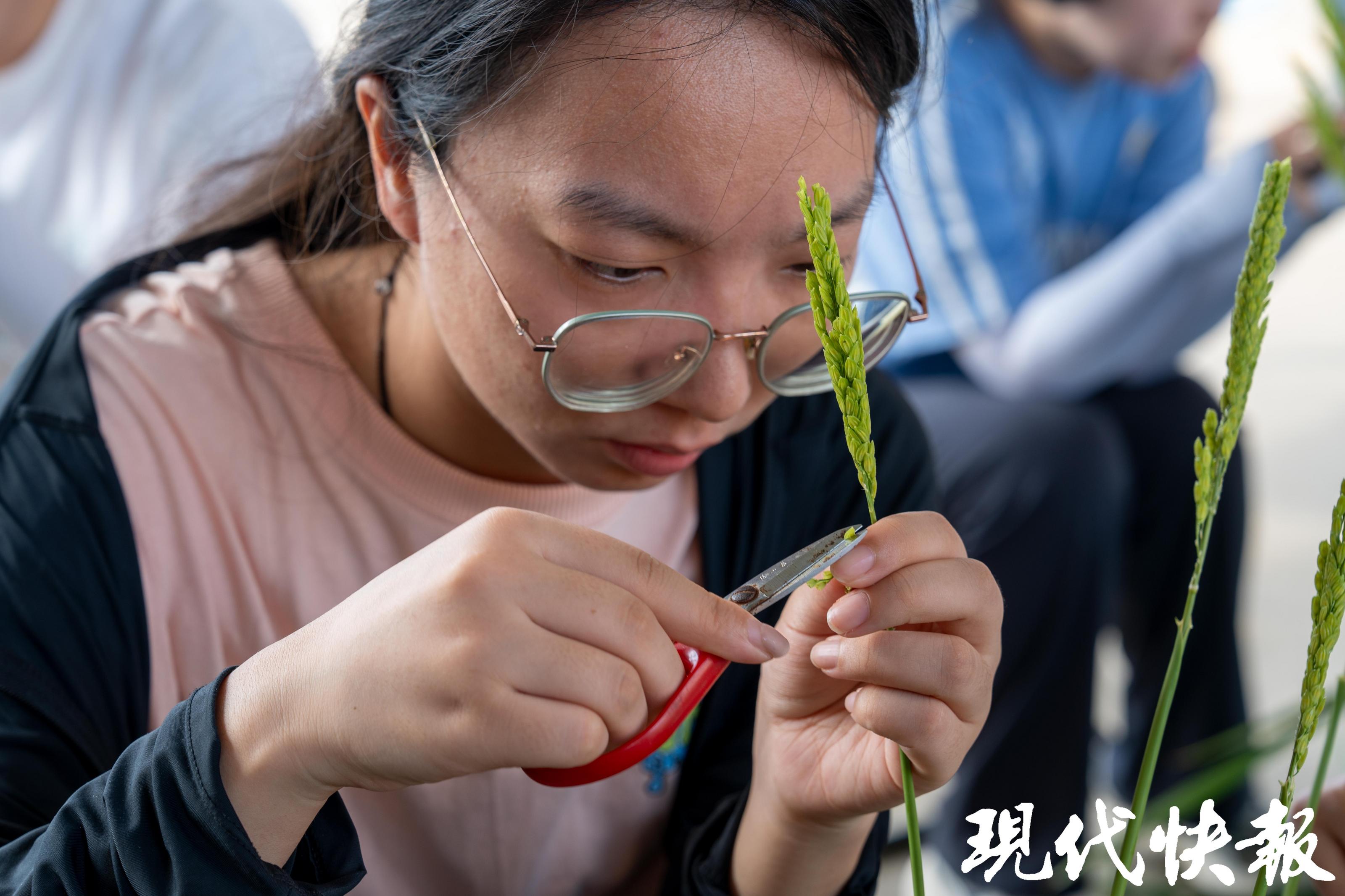 在等待的时候,陶亚军时不时就到水稻田里转一圈,凭经验观察稻穗的状态。“差不多了,一会儿就要开了。”水稻花一开,陶亚军和同学们就唰唰“出动”了,到稻田里抓紧时间进行父本采集。