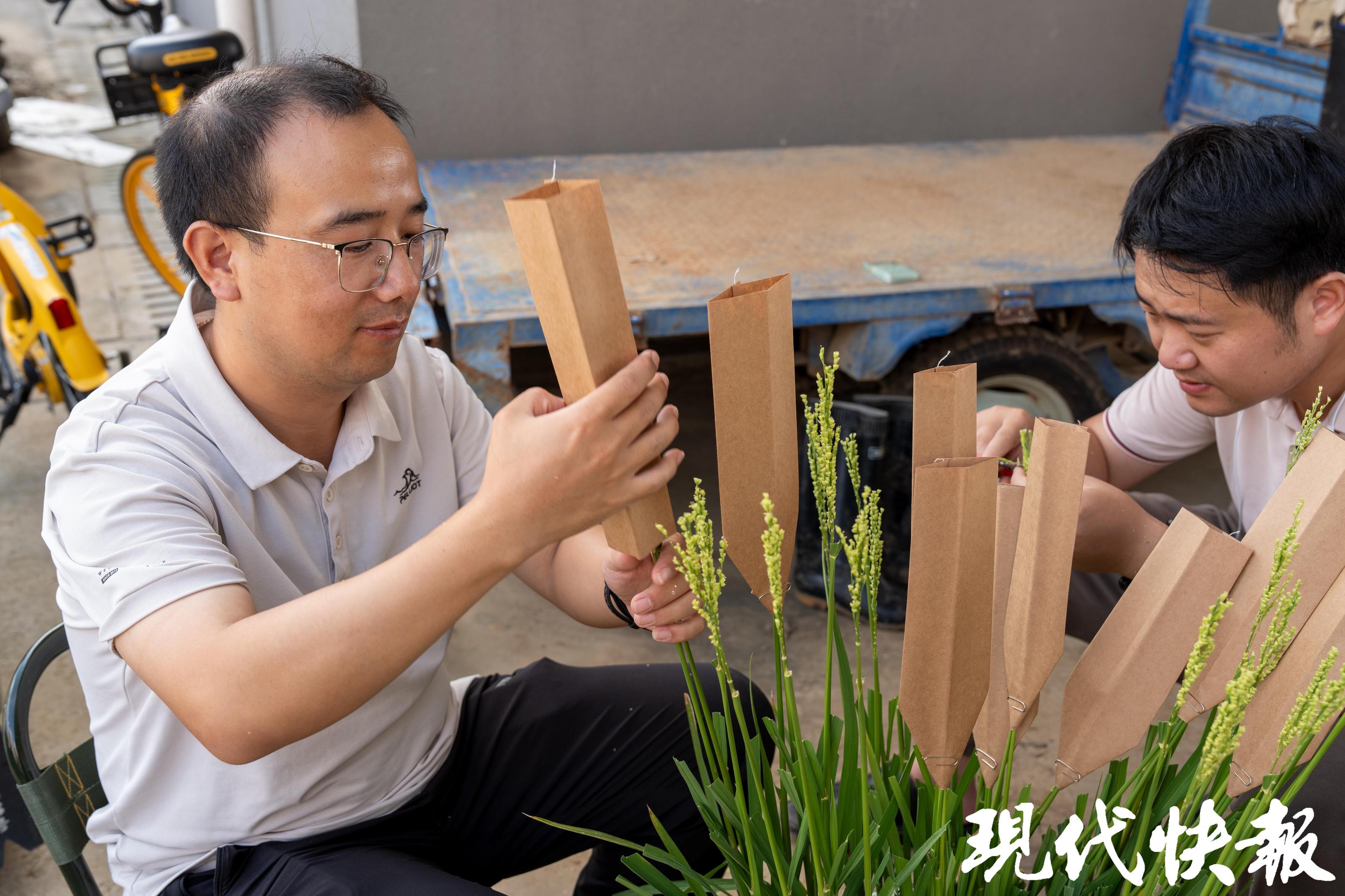 只见陶亚军捻起稻穗,对准已经套好纸袋的去雄植株上,轻轻一抖,授粉就完成了。这在外人看起来很简单。实际上,抖粉可是个技术活,非常考验科研人员的力度、速度等关键性技巧。
