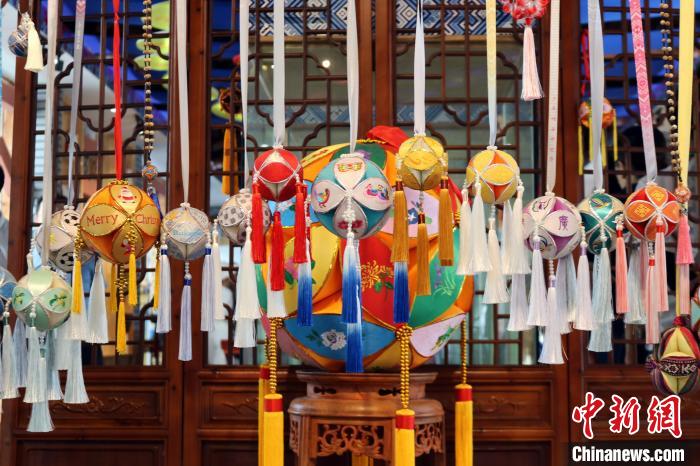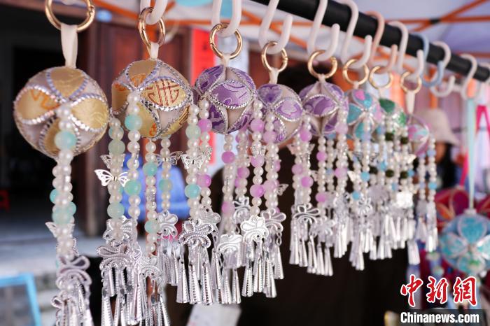 8月27日,在广西靖西市旧州街,制作精美的绣球挂饰吸引眼球。 中新社记者黄艳梅摄