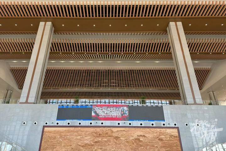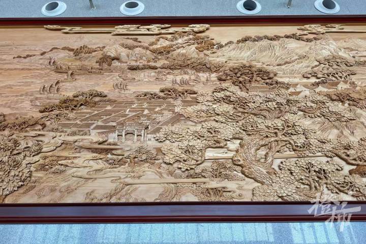 走进进站大厅,在电子LED显示屏下方悬挂了木雕作品《锦绣东阳》,这一木雕作品出自中国工艺美术大师陆光正创作室,长18米,高3.6米,展示了东阳的特色人文景观。