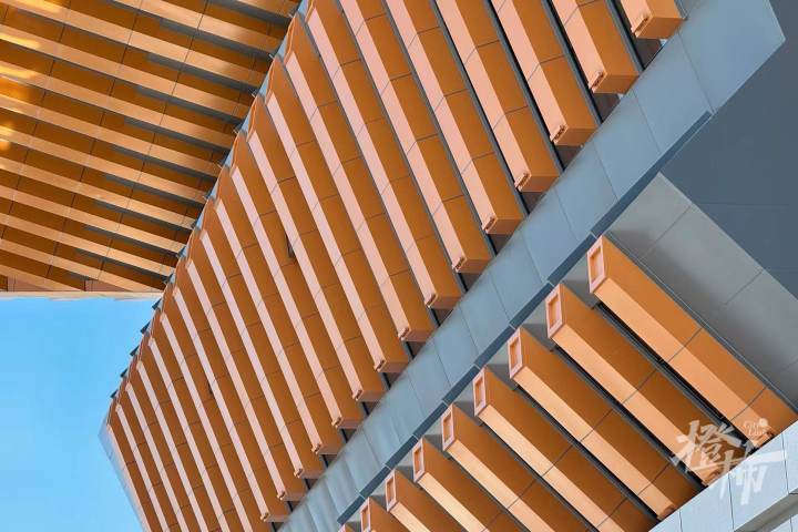 坐车接近横店站,远远望去,站房造型让人眼前一亮,站房设计以东阳木雕为基础,大量使用了东阳木雕工艺,将传统木结构屋顶的檐椽转化为现代形式,并在檐椽间点缀古建筑的瓦片。