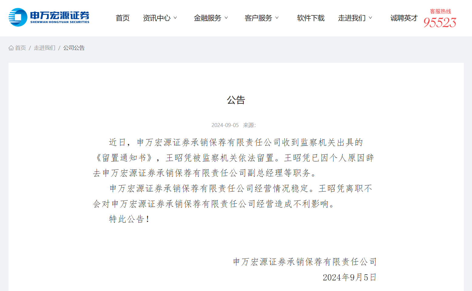 同时,上述公告还提到,申万宏源证券承销保荐有限责任公司经营情况稳定。王昭凭离职不会对申万宏源证券承销保荐有限责任公司经营造成不利影响。