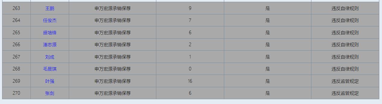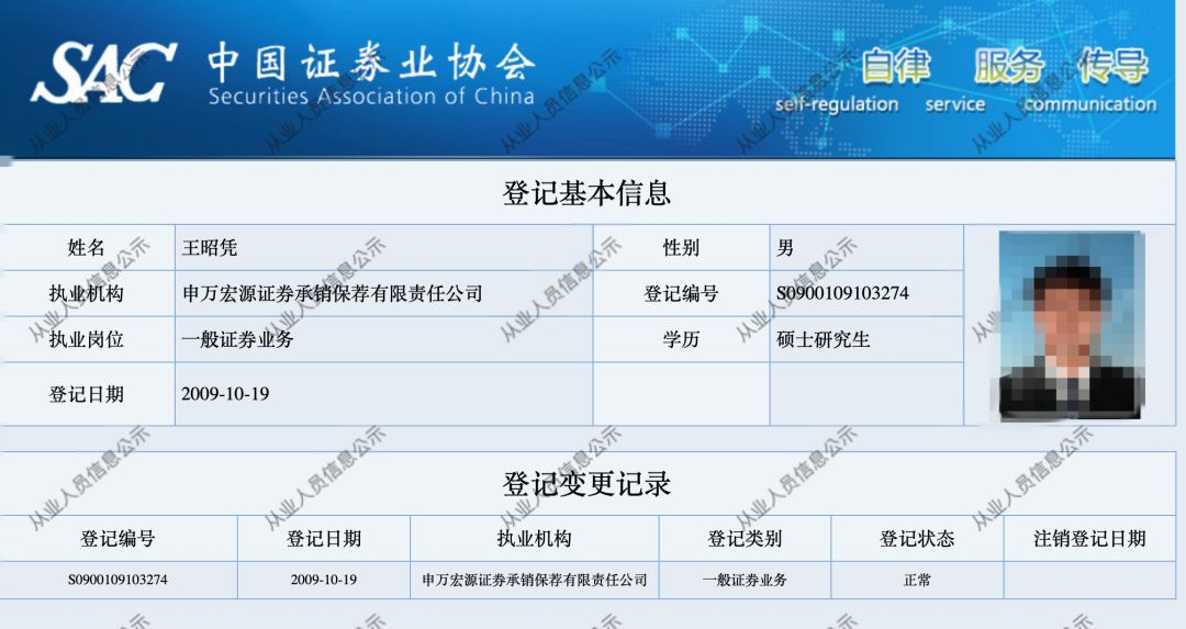 中国青年网记者今日上午,再次登录中国证券协会官网,在该机构“申万宏源承销保荐”执业名单中,已查询不到关于王昭凭本人的信息!名单显示,现有执业人员270人,其中编号为263至270的8名执业人员,违规失信信息一栏显示为,违反监管规定。