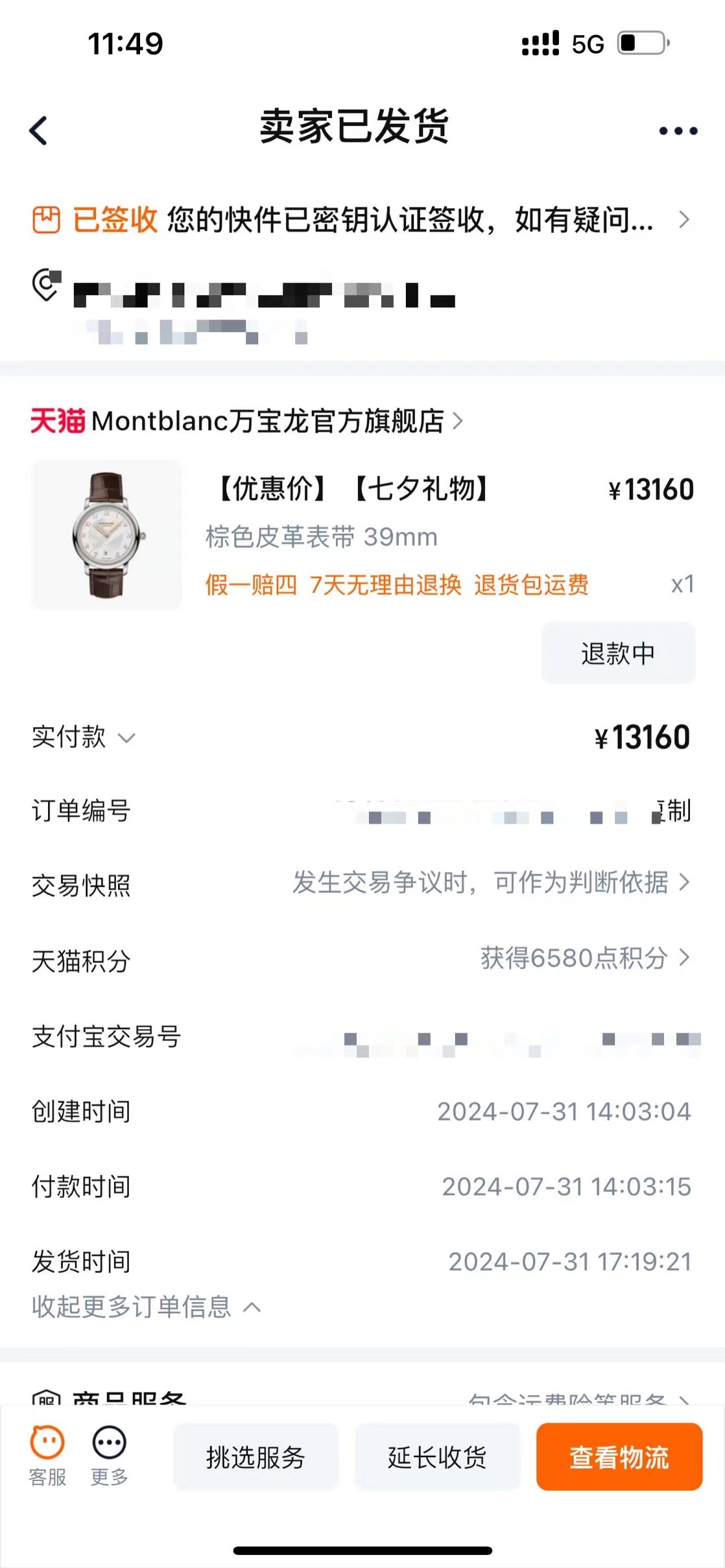 近日,来自四川成都的消费者孙女士向澎湃公众互动平台“服务湃”(https://tousu.thepaper.cn)反映,7月31日,她在淘宝“Montblanc万宝龙官方旗舰店”买了一款价值1.3万元的棕色皮带手表,8月6日收到货后发现手表外观与预期不符,联系商家将表退回。
