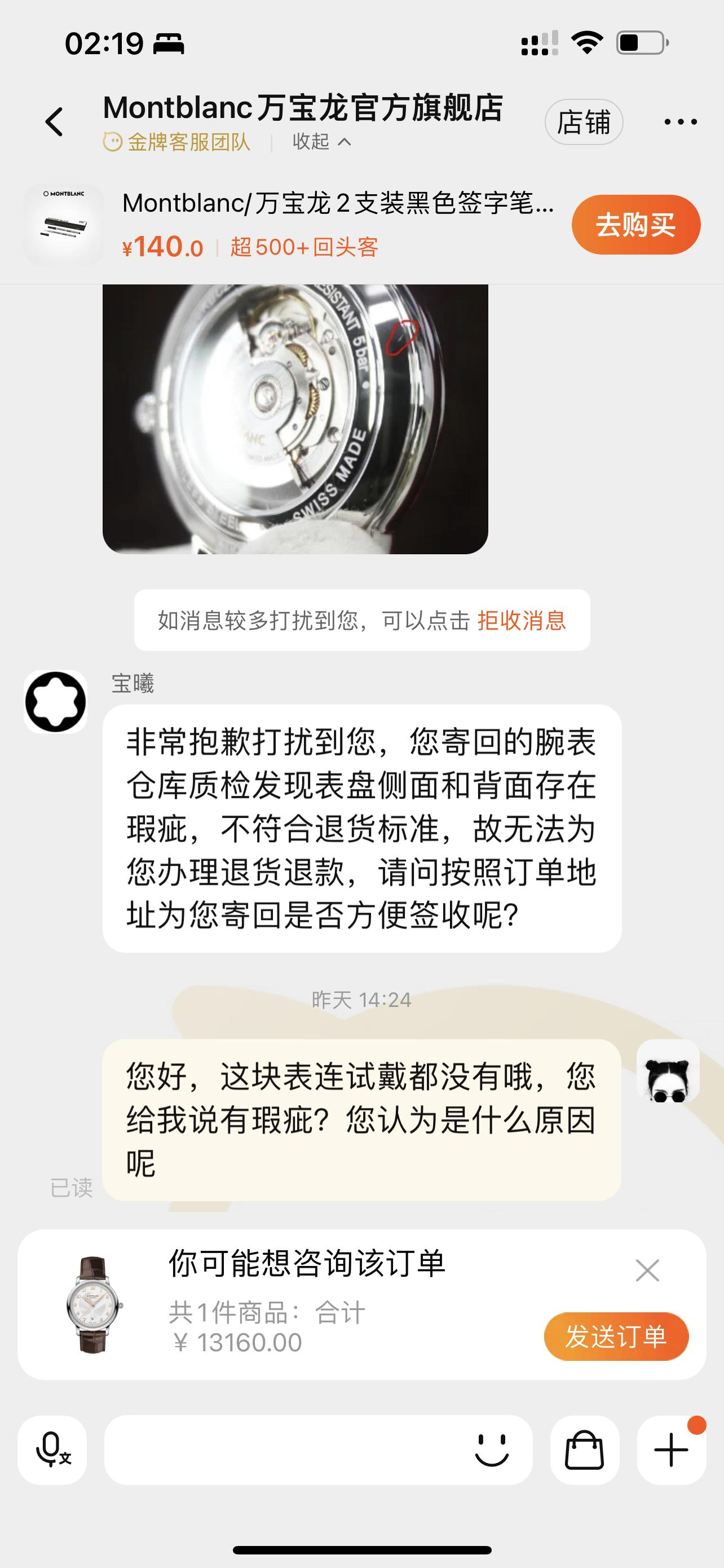 孙女士称,8月14日,“Montblanc万宝龙官方旗舰店”客服联系她称表盘侧面和背面存在瑕疵,不符合退货标准。孙女士很困惑,“手表没有试戴”,“手表的塑封膜自始至终没有拆封,为何会造成瑕疵?”