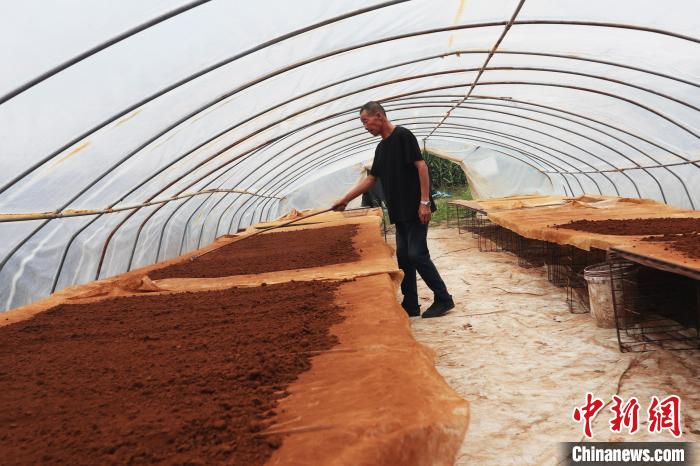 李俊在灵芝大棚里查看收粉情况。 苍雁摄