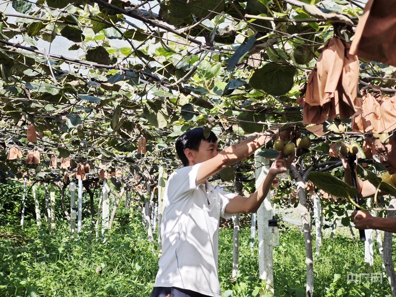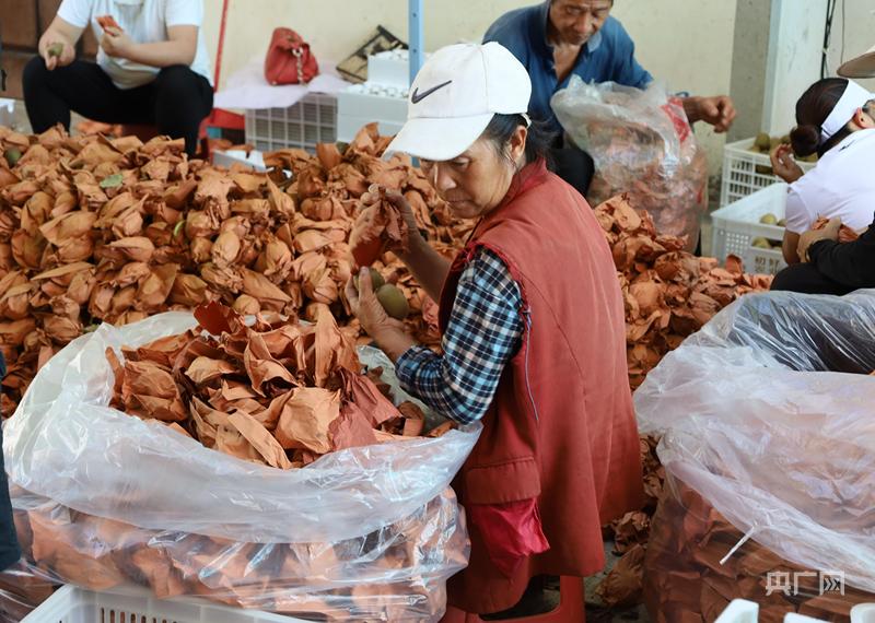 村民给猕猴桃脱去纸袋(央广网实习生李婷婷摄)