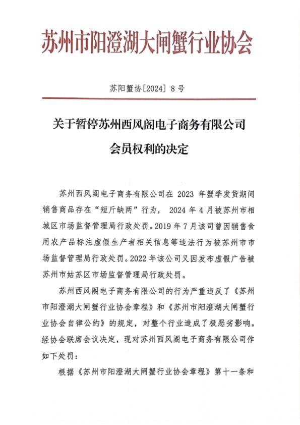 记者注意到,“蟹太太”品牌所属公司为苏州西风阁电子商务有限公司,而据苏州市阳澄湖大闸蟹行业协会今年6月份的公告,该公司因在2023年蟹季发货期间销售商品存在“短斤缺两”行为,已被暂停会员权利。