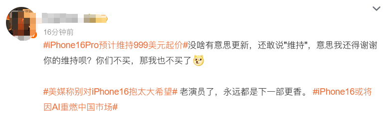 而网友对此的评价却褒贬不一,有网友认为:“没啥有意思的更新,还敢说维持,老演员了,永远都是下一部更香。”、“苹果最正常的点就是这么多年起售价一直没怎么涨,iphone4就卖四五千,到了15照样五千多起售