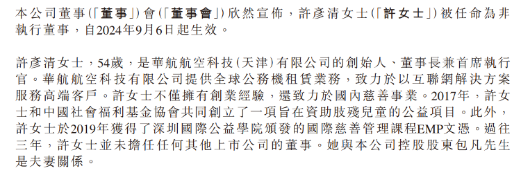 据公开资料显示,许彦清的职业履历十分丰富。54岁的她是华航航空科技(天津)有限公司的创始人、董事长兼首席执行官。这家公司主要从事提供全球公务机租赁业务,致力于以互联网解决方案服务高端客户。