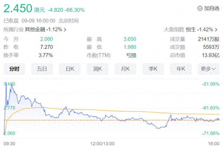 此前因创始人被调查事件深陷风波的华兴资本终于迎来了复盘时刻。9月6日晚间,华兴资本控股发布公告称,已向香港联交所申请自2024年9月9日上午9时起恢复普通股买卖。值得注意的是,华兴资本9月9日复盘后,股价较复盘前价格出现暴跌。据了解,上一交易日为2023年3月31日,股价报收7.27港元/股,9月9日开盘报2.06港元/股,收盘报2.45港元/股,跌幅66.30%,全日成交近5600万港元,市值较停牌前缩水27亿港元。