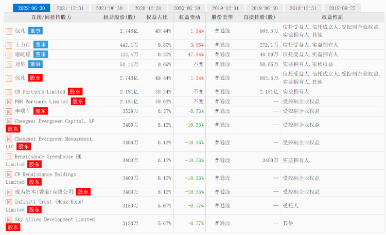 公开资料显示,许彦清2018年对该公司也曾间接持股。CR Partners Limited由FBH Partners持有73.37%的权益。而对于FBH Partners,包凡、许彦清分别持有79%及21%的权益。