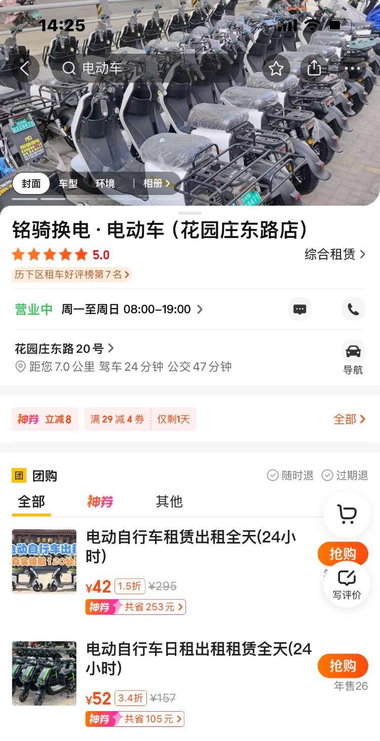 位于花园庄东路的铭骑车行是一家主业为外卖骑手租赁电动车、更换电动车电池,副业是旅游租赁电动车的综合性车行。“我们的电动车规格整体偏大,续航100公里,平时49元一天,但美团团购会给优惠7元。遇到中秋、国庆(假期),日租价格会上浮十块钱。”店员冯先生向记者介绍道。