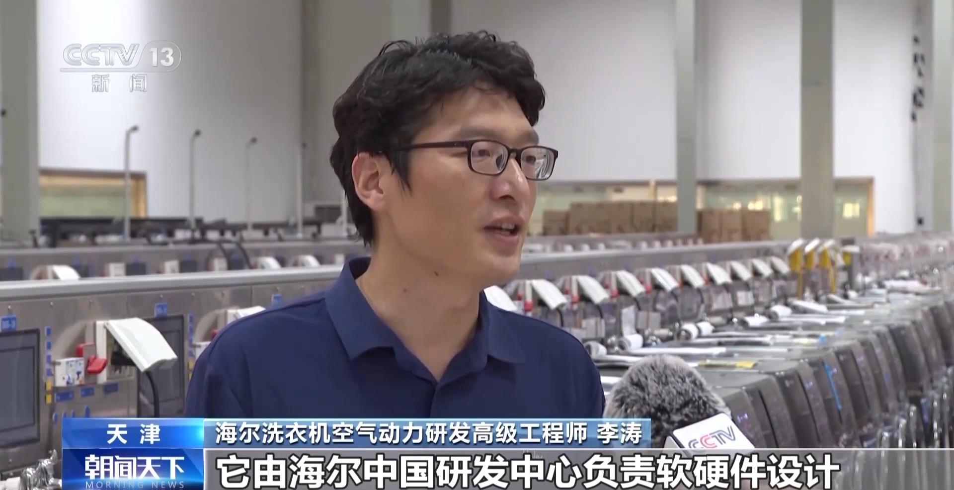 海尔洗衣机空气动力研发高级工程师 李涛:它由海尔中国研发中心负责软硬件设计,澳洲研发中心负责电机的技术升级,欧洲研发中心解决节能问题,美国研发中心提供新风技术解决方案,生产制造则是在中国。