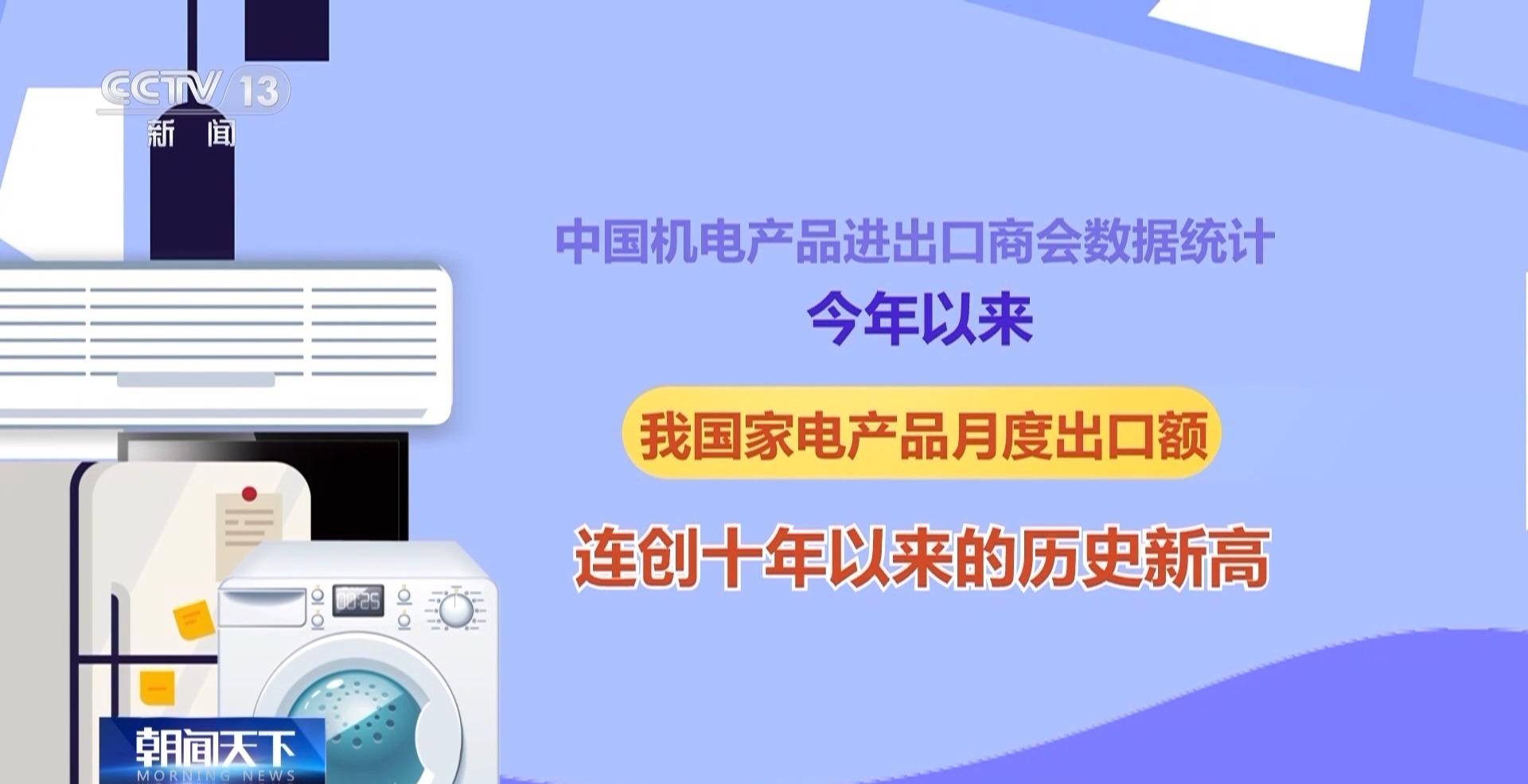 中国机电产品进出口商会数据统计,今年以来,我家电产品月度出口额连创十年以来的历史新高。2024年全年,中国家电出口预计超过1200亿美元,再创历史新高。