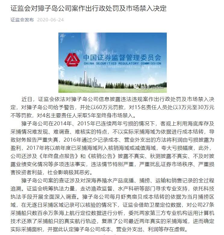 直至2020年6月24日,长期“跑路”的扇贝终于得到了清白。证监会公告称,依法对獐子岛信息披露违法违规案作出行政处罚及市场禁入决定,对獐子岛公司给予警告,并处以60万元罚款,对15名责任人员处以3万元至30万元不等罚款,对4名主要责任人采取5年至终身市场禁入。