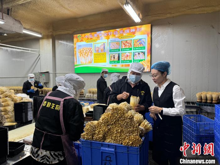 在香勤公司的生产车间内,只见一瓶瓶黄色金针菇和荔枝菌搭乘遍布厂区的全自动运输装置,从育种车间进入菌菇房培养,再从菌菇房进入采摘车间进行成品切割,最后从采摘车间进入包装车间包装下线。