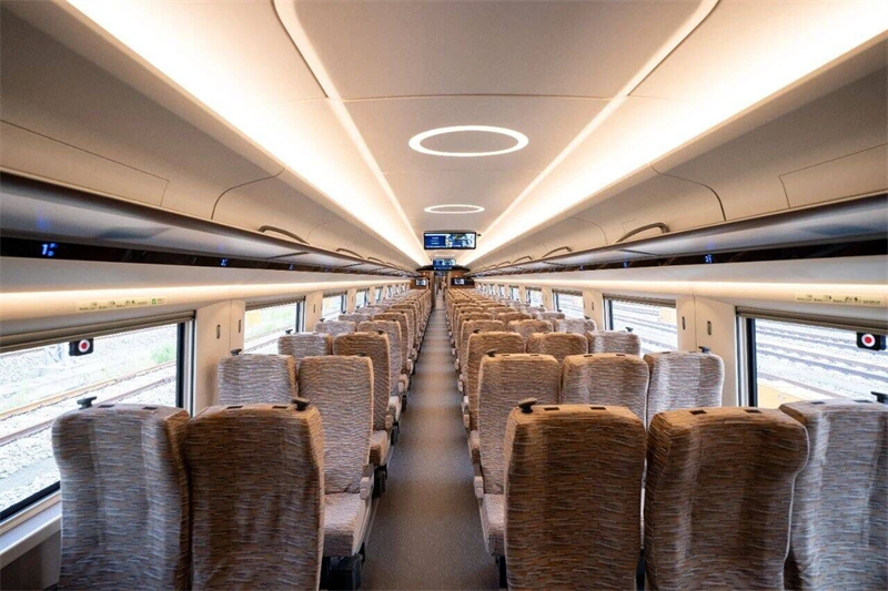 其中,在2至8车厢内均增加1个大件行李柜,二等座车厢座席由18排增加到了19排,列车定员增至619人,提高了动车组列车载客能力;同时,该车型采用降噪内风挡新型地板及墙板减振器,有效降低客室噪声,并在二等座座椅靠背处设置USB接口,座椅下方的充电接口新增TypeC接口,旅客充电将更加方便;此外,该车型餐车采用了开放式吧台,客室采用一体化变频空调进一步提升旅客乘坐舒适性和便捷性。