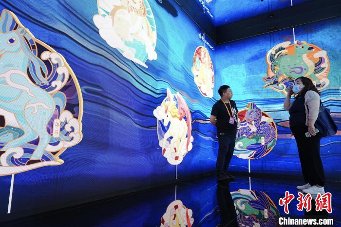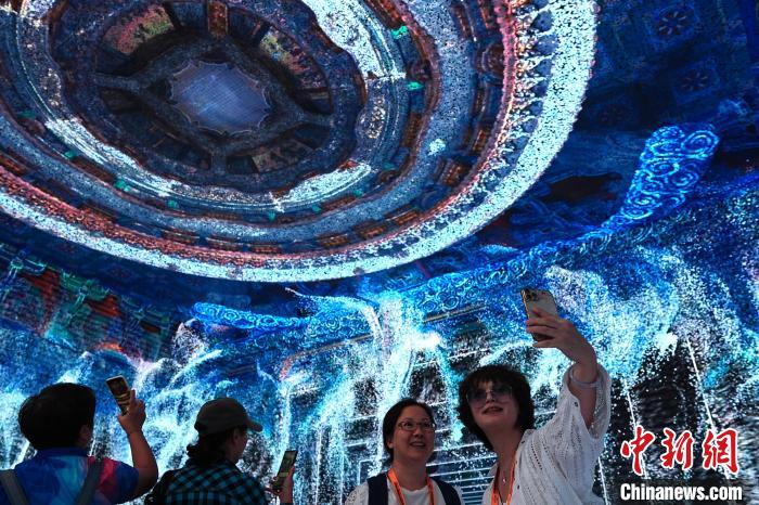 2024年服贸会文旅服务专题,观众参观“穹天玉宇”沉浸式中国藻井数字艺术体验空间。 中新社 记者 赵文宇 摄