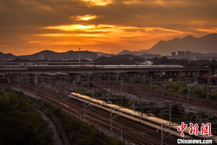 落日的余晖照耀在赣鄱大地上,沪昆高铁线宛如一条金色丝带,向城市、山间蜿蜒伸展。(完)