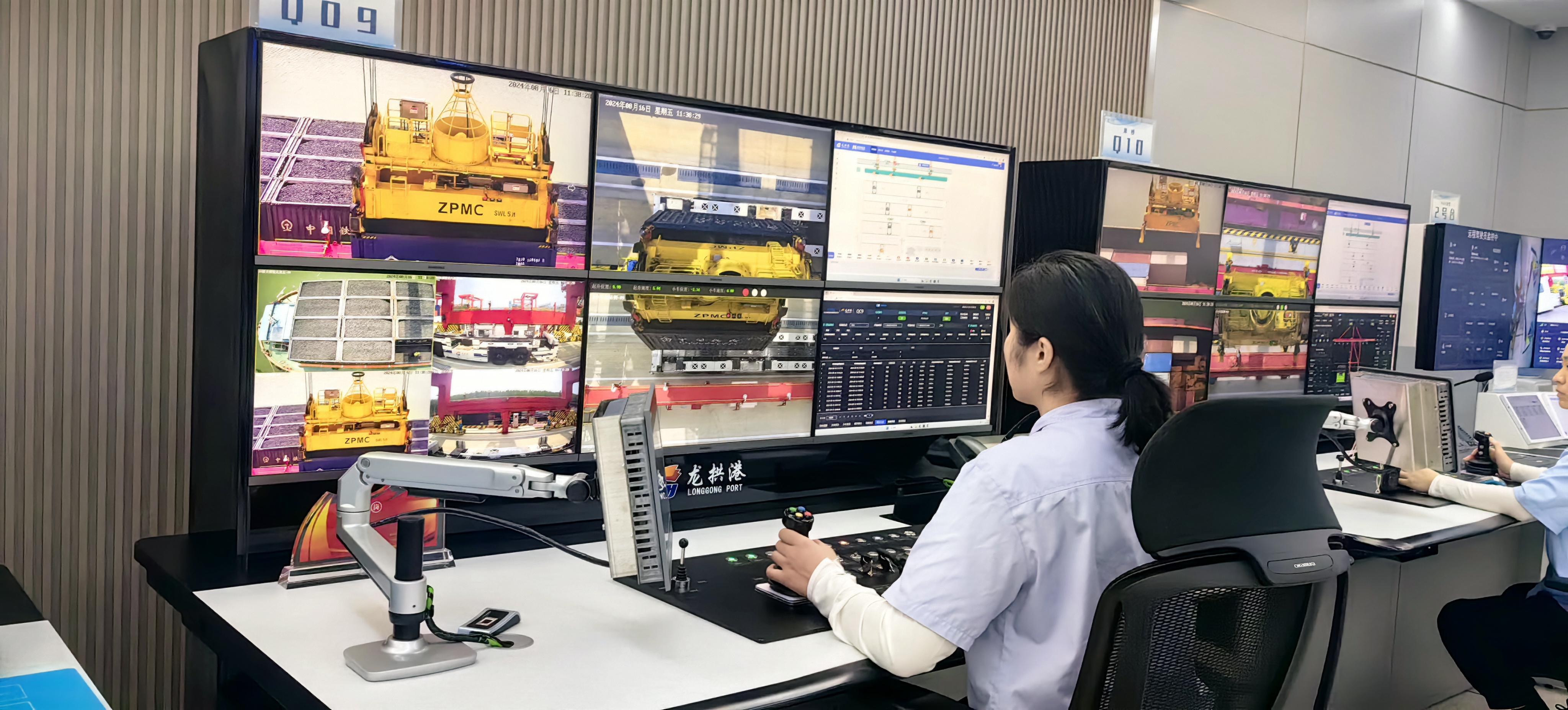 沿梁山港南下行至京杭大运河的支流龙拱河畔,一个智慧化集装箱内河港口——龙拱港在此崛起。记者在龙拱港控制中心看到,操作员远程操控手柄,几百米外的自动化轨道吊车将集装箱精准放置到智能卡车上,卡车沿着既定路线穿行在港口和集装箱堆场之间,整个现场作业区没有一名工作人员。