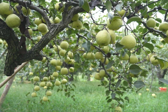 “果园里的这棵梨树树龄最大,每年我们都会控制它的产量在1000斤左右。由于它结出的果子皮薄、甜度高、渣少而且核还小,每年在梨花节的时候,这棵树上的梨都已经订购完毕。”果农谢大为高兴地说。