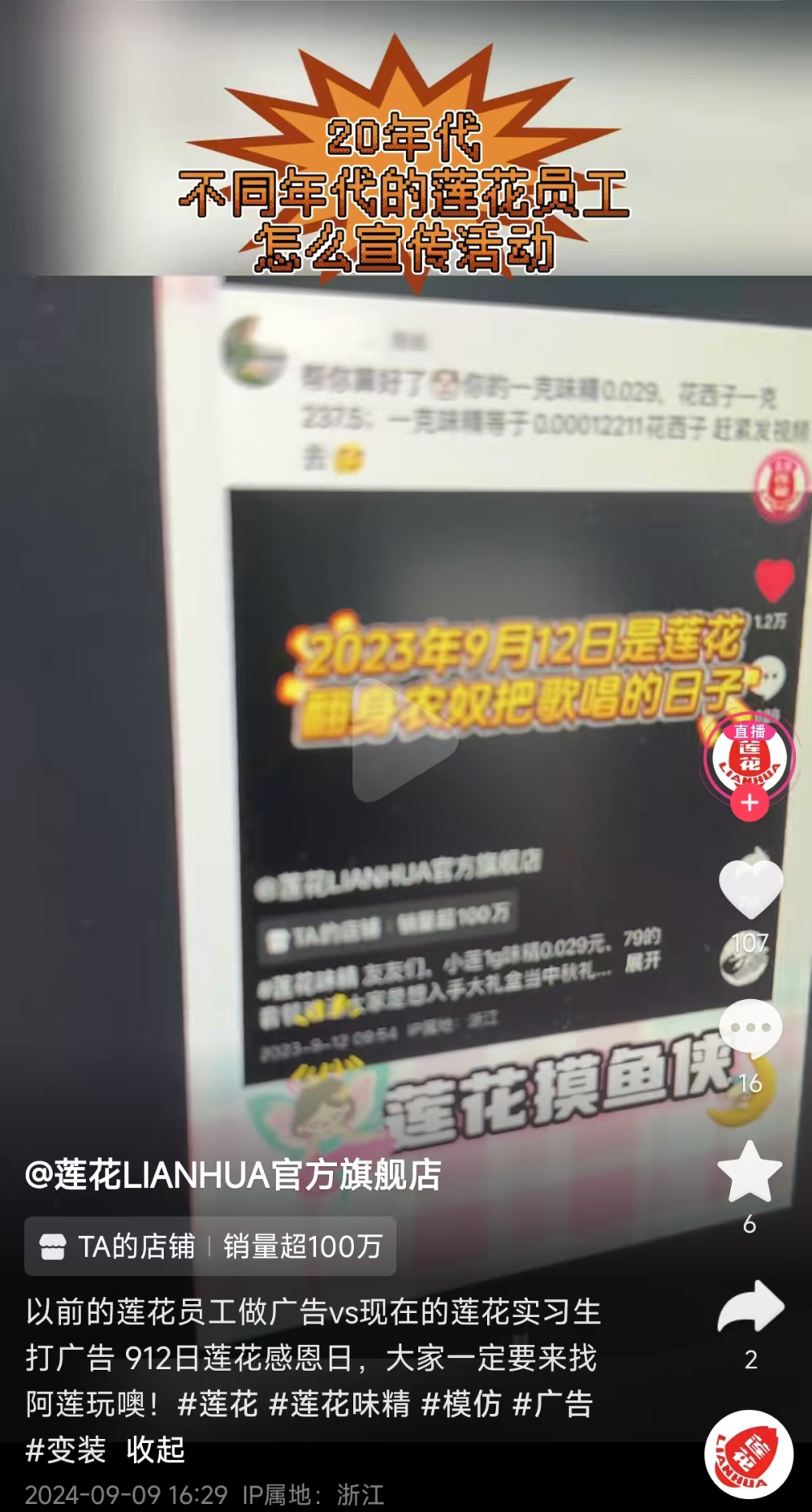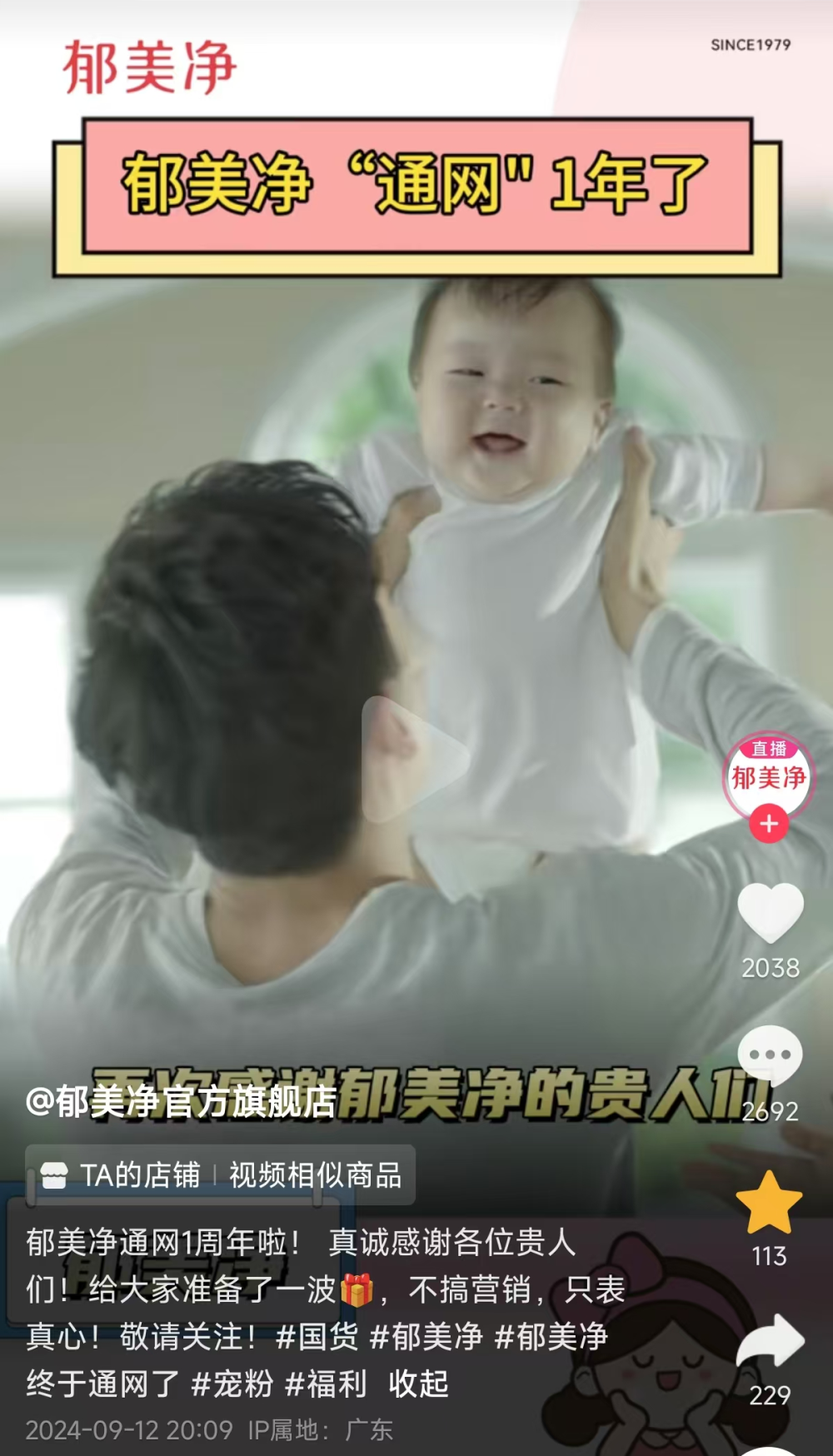 老牌国货郁美净、莲花味精同样保持了良好的增粉势头。2023年9月14日,国货品牌郁美净官宣全面入驻各大平台,网友笑称“终于通网了”。当晚,郁美净董事长史滨参与郁美净首次直播,跳舞感谢观众,并说“各位今天看见我的,都是郁美净的贵人”。截至2024年9月19日,郁美净的抖音粉丝数已经达到了130.5万。