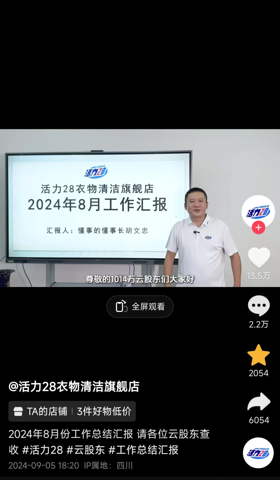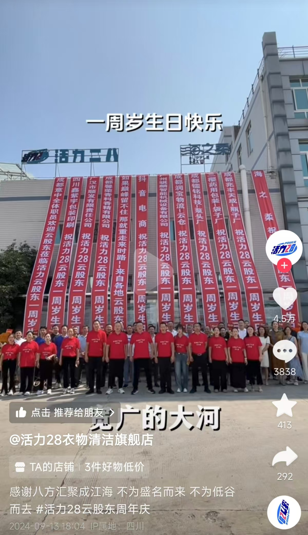9月13日,活力28举办了开播一周年庆典,他们将庆典办成了云股东一周年生日会,用这样的方式来感谢粉丝们。从评论区来看,活力28 的质量可靠是粉丝们买单的主要原因,活力28还在其他视频中承诺尽量不涨价,也收获了广泛好评。