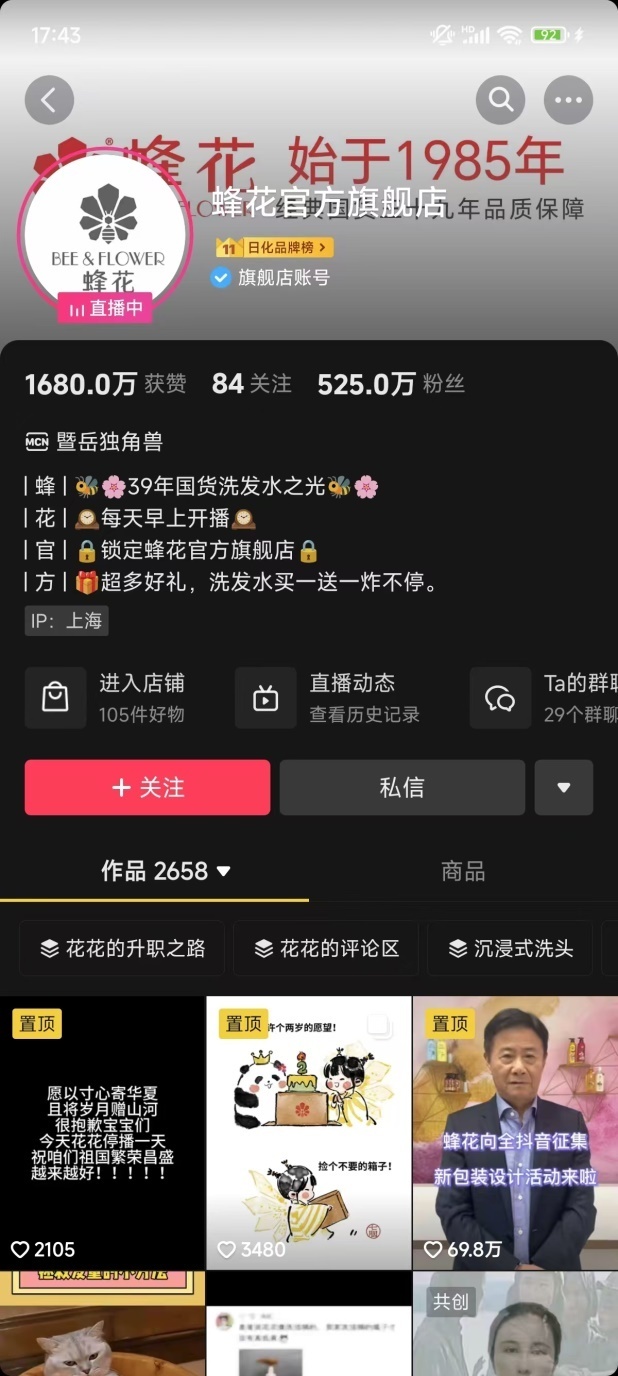 去年国货狂欢中率先出来“蹭热度”的蜂花,凭借“连夜上架3款79元的洗护套餐”“快递箱都是捡来的”等话题一度引发热议。如今,蜂花官方旗舰店的抖音粉丝数已经达到了525万,同样也维持了较高的热度。
