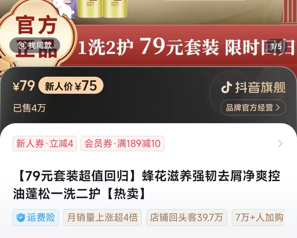 蜂花在去年“79元眉笔事件”刚刚爆出来的时候,迅速上架了3款79元的洗护套餐,被认为是一次很成功的“蹭热点”。有意思的是,近期蜂花又推出了“79元套装超值回归产品”,销量显示目前该产品累计销售已达4万。