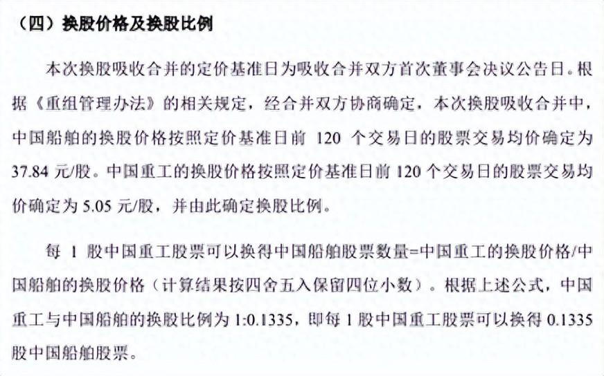 据公告,本次换股吸收合并中,中国船舶的换股价格按照定价基准日前120个交易日的股票交易均价确定为37.84元/股,中国重工的换股价格为5.05元/股,均高于停牌前双方的股票价格。