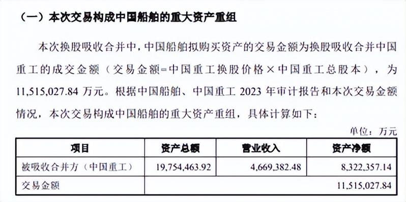 9月18日晚间,中国船舶和中国重工两家公司发布公告,中国船舶将以发行A股股票方式换股吸收合并中国重工。换股吸收合并中,中国船舶拟购买资产的交易金额,为换股吸收合并中国重工的成交金额,根据“交易金额=中国重工换股价格×中国重工总股本”,交易金额为1151.50亿元。