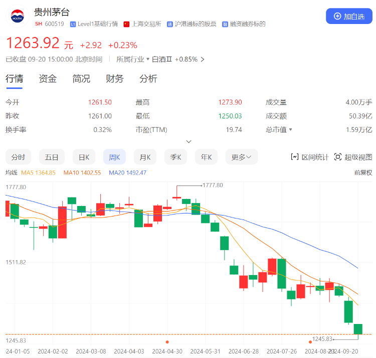 然而,贵州茅台此次的注销式回购也被视为维护公司股价的一个重要手段。从市场方面来看,今日酒价披露的最新批发参考价显示,2024年飞天茅台散甁价格报2365元/瓶,与上一日持平;2024年飞天茅台原箱报2470元/瓶,较上一日再跌20元。从股价方面来看,今年贵州茅台的股价走势整体呈现“乏力”,从5月开始,呈现出了明显的下跌态势,昨日最低价达到1245.83元/股,创出了近4年以来新低。截至今日收盘,贵州茅台股价报收1263.92元/股,今年该股股价跌幅超过25%。
