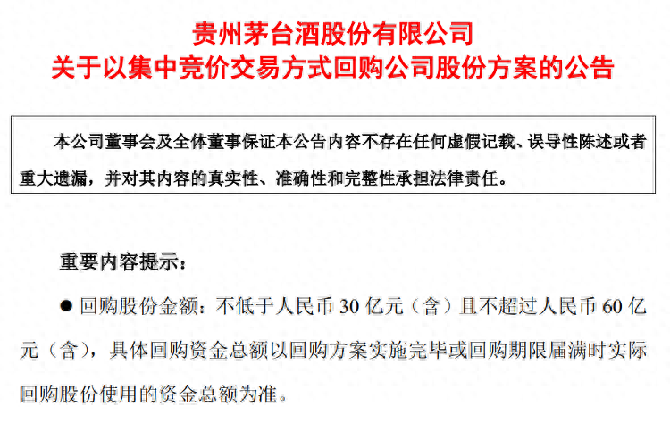 9月20日晚,贵州茅台发布公告,公司将以自有资金回购股份用于注销并减少公司注册资本 ,回购股份金额不低于人民币30亿元(含)且不超过人民币60亿元(含),回购价格上限为1795.78元/股(含),回购股份数量在1670583股至3341164股,回购股份数占公司总股本比例为0.1330%至0.2660%。