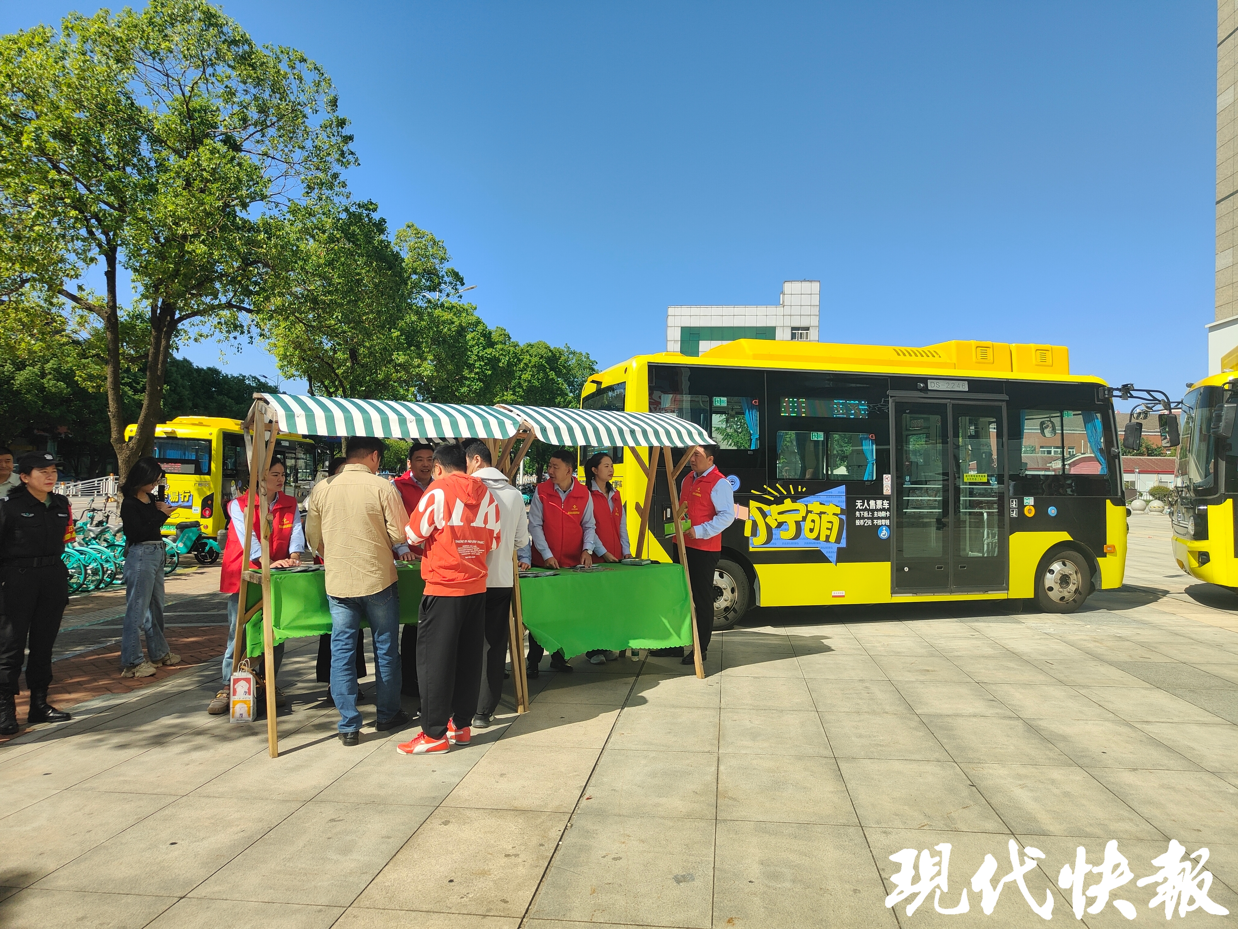 9月22日上午,在南京江宁区一处广场上,两辆黄色的小宁萌公交车亮眼吸睛。这是江宁公交集团联合江宁开发区管委会企业服务中心开展的“‘宁易行’助力低碳生活 累积分 悦享公共出行”宣传活动,向市民乘客倡导绿色出行,助力低碳生活,现场不少市民围着摊位与公交工作人员交流。