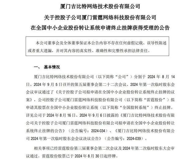 20日晚,厦门吉比特公告披露,控股子公司雷霆股份于9月18日向全国股转系统提交了终止挂牌的申请材料。经审查,全国股转系统作出了同意受理的决定,并向雷霆股份出具了《受理通知书》。