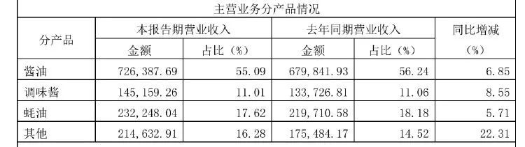 半年报显示,海天味业长期以来深耕于调味品的生产与营销,目前公司拥有涵盖酱油、蚝油、调味酱、醋、料酒、各类复合调味料以及粮油米面、发酵饮料等丰富品类的产品线。其中,海天酱油、海天蚝油的市场占有率连续多年位居全国第一。具体产品来看,公司收入第一大来源酱油产品贡献过半的营收,同比增长6.85%;另外两大核心产品调味酱和蚝油,增幅分别为8.55%、5.71%。