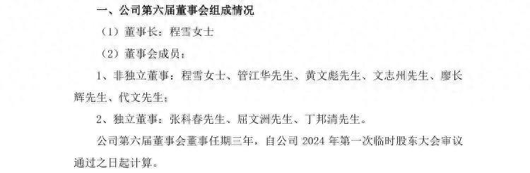 新一届董事会由程雪担任董事长,董事会成员包括程雪、管江华、黄文彪等6位非独立董事及3位独立董事。董事会及监事会的任期均为三年。程雪此前曾担任海天味业副董事长、执行总裁,因其从打工人到股东的身份转变,被称为“酱油女王”“打酱油的女富豪”。数据显示,2023年,程雪税前年薪669.83万元。