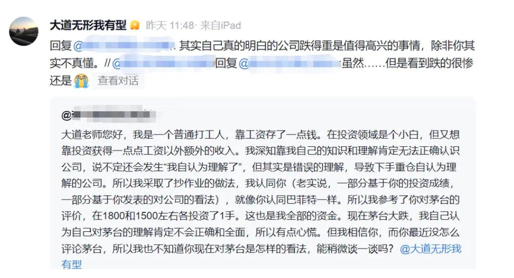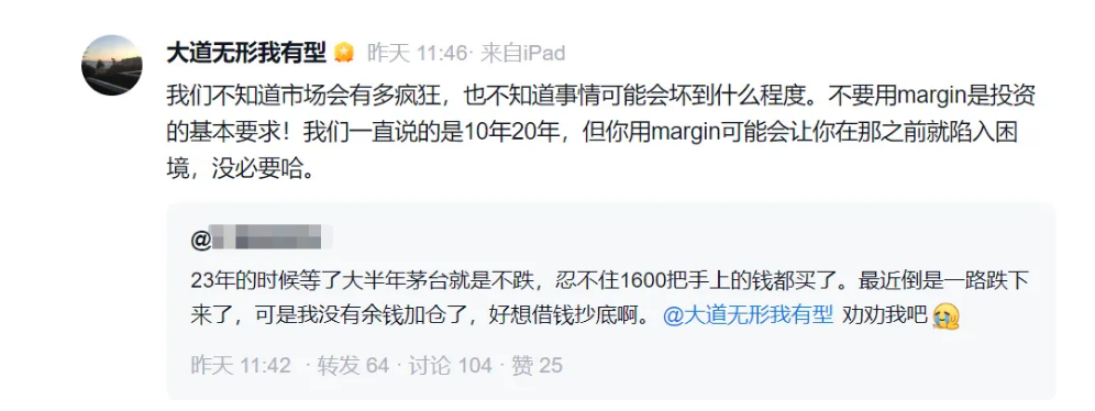 有网友表示:“2023年的时候等了大半年茅台就是不跌,忍不住1600元把手上的钱都买了。最近倒是一路跌下来了,可是我没有余钱加仓了,好想借钱抄底啊。”段永平(大道无形我有型)劝其慎重,不要借钱买,因为“不知道市场会有多疯狂,也不知道事情可能会坏到什么程度”。