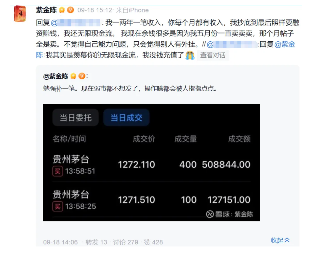 与此同时,在股价持续走低之际,知名小说家紫金陈9月18日曾在社交平台发布动态,表示自己抄底了500股茅台。交易账单显示,紫金陈这笔抄底花费超过63万元。