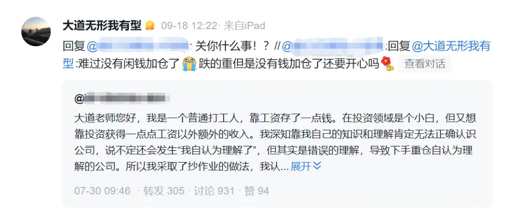 不过,面对该网友的质疑:“难过没有闲钱加仓了,跌得重但是没有钱加仓了还要开心吗?”段永平则毫不客气地怒怼:“关你什么事!?”